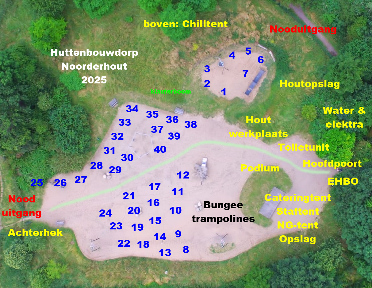 Hier staat de voorlopige plattegrond van Huttenbouwdorp Noorderhout 2025. Er kunnen nog wijzigingen komen.